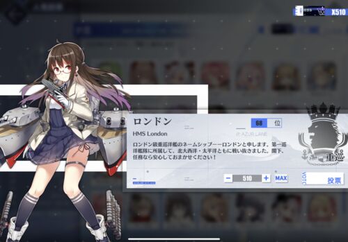 令和元年9月14日(土) どうも! アズレン太郎です(*´Д`) 只今絶賛開催中の、 アズレン人気投票! 我らがロンドンちゃんは、、、 なんと現在グループAの12位(*´Д`) 3位以内なら決勝進出なのですが、 投票締め切りは明後日の16日。 現在の投票数を見ると正直…
